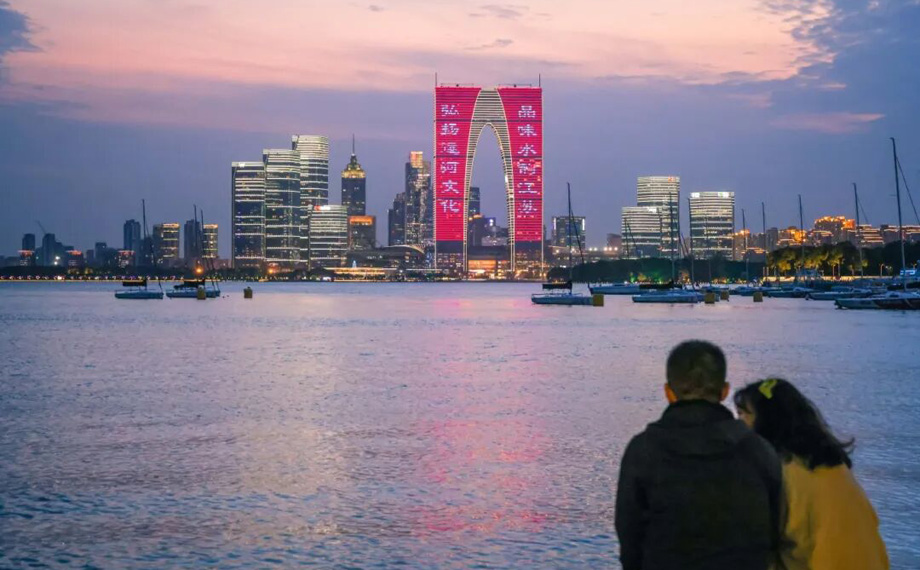 清晨至日暮,隨處可見結(jié)伴而行的游客與市民,他們手持手機(jī),沿著波光粼粼的湖岸線,開啟了一場別開生面的“打卡尋愛”之旅。從金雞驛01的起點(diǎn)出發(fā),現(xiàn)代地標(biāo)東方之門是必拍的背景板;信步至蘇州中心商場,新開的特色首店成為旅程中的驚喜插曲;在充滿藝術(shù)感的《圓融》雕塑前,人們尋找著最佳光影角度;而李公堤的中法愛墻前,更是人頭攢動(dòng),不同語言的“我愛你”成為無數(shù)情侶定格深情瞬間的浪漫見證。