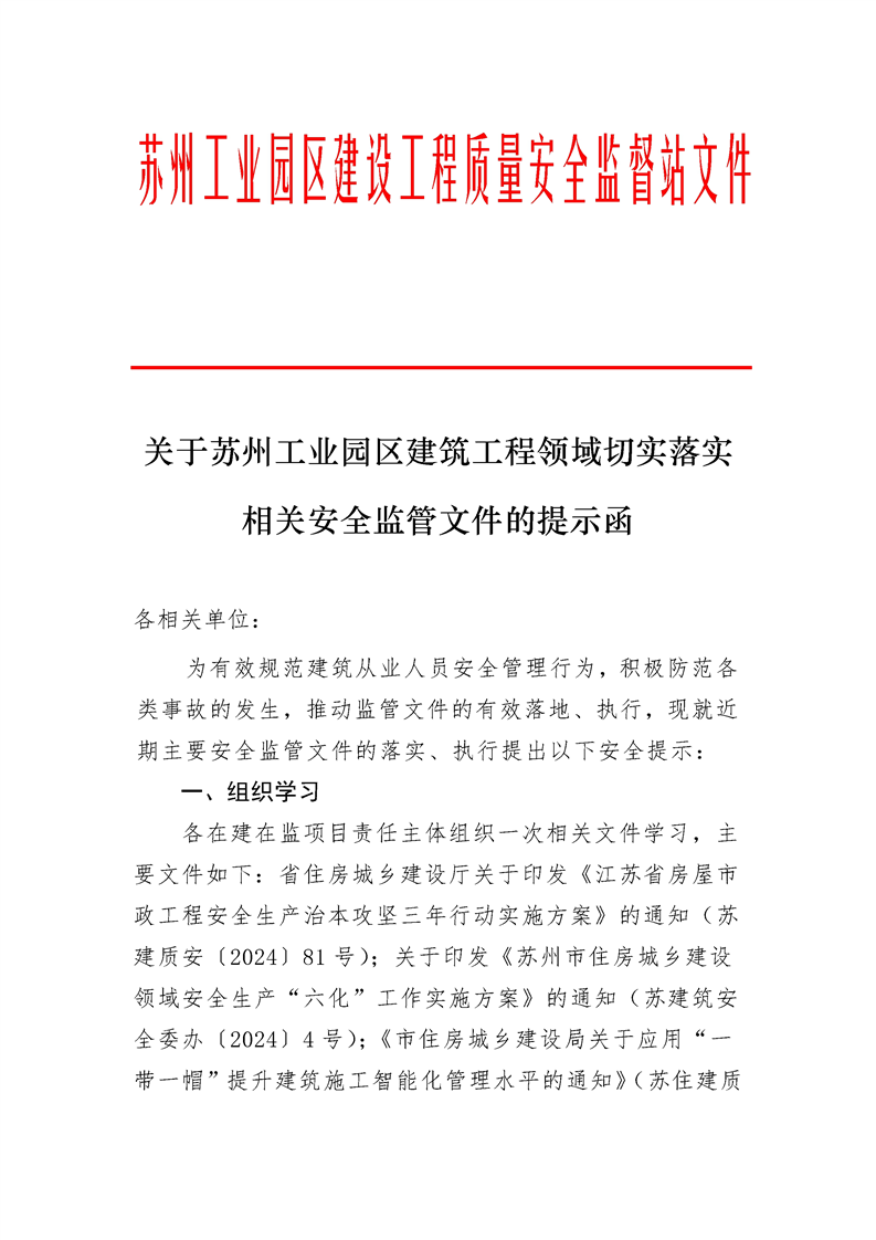 關于蘇州工業(yè)園區(qū)建筑工程領域切實落實相關安全監(jiān)管文件的提示函