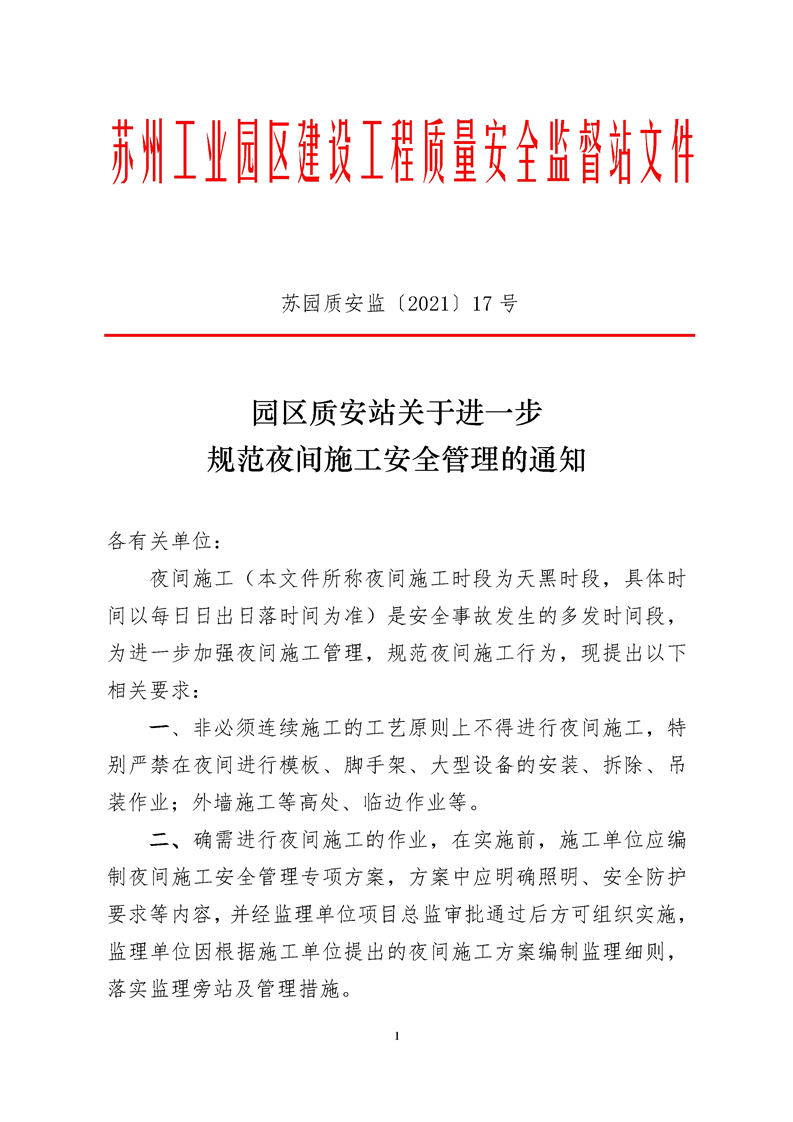 園區質安站關于進一步規范夜間施工安全管理的通知