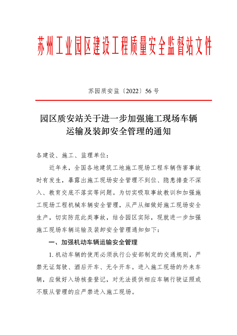 園區質安站關于進一步加強施工現場車輛運輸及裝卸安全管理的通知