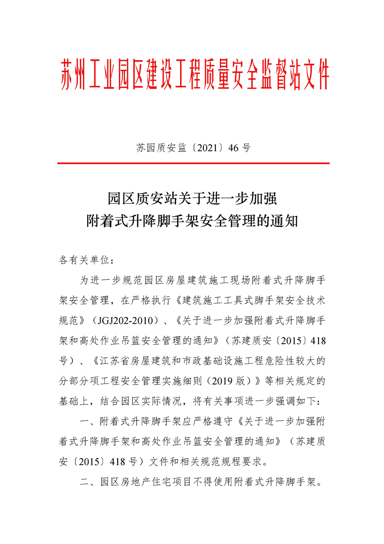 園區(qū)質(zhì)安站關(guān)于進(jìn)一步加強(qiáng)附著式升降腳手架安全管理的通知