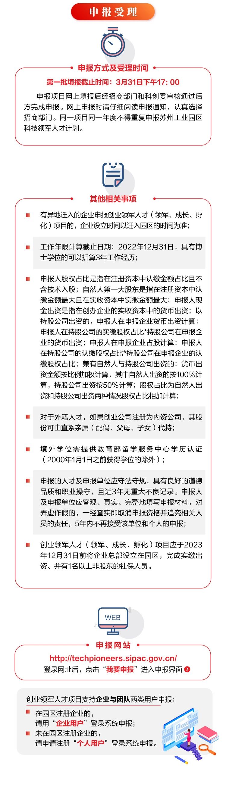 為加快推進開放創新的世界一流高科技園區建設,進一步加大高層次創新、創業領軍人才(團隊)引進力度,不斷提升園區創新源地、產業高地建設水平,現啟動第十七屆第一批園區科技領軍人才創新創業工程的申報工作。本屆科技領軍人才分兩批次集中受理評審,目前第一批正在申報。歡迎申報,載體請選擇:蘇州工業園區科技招商中心!
