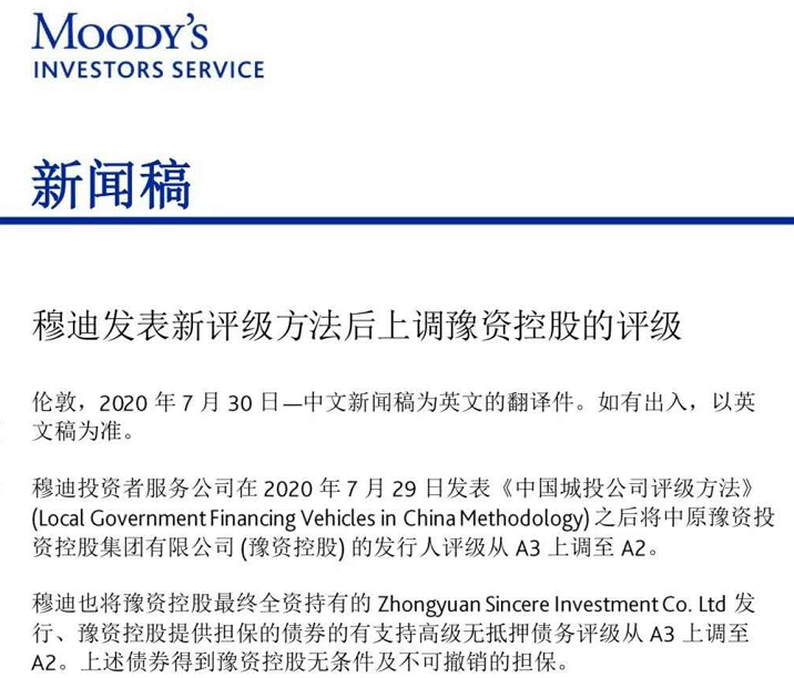 中原豫資投資控股集團有限公司 喜獲國際評級機構(gòu)穆迪上調(diào)至A2主體評級2020.07.31