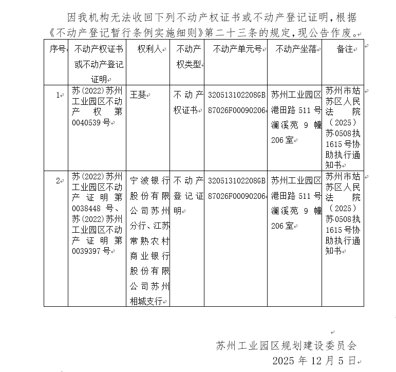 不動產權證書/登記證明作廢公告蘇園 證廢字2025(0196)號(瀾溪苑9幢206室)