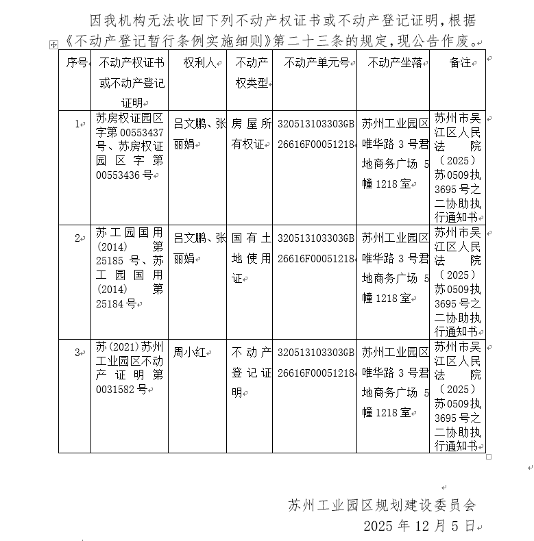 不動產權證書/登記證明作廢公告蘇園 證廢字2025(0194)號(君地商務廣場5幢1218室)