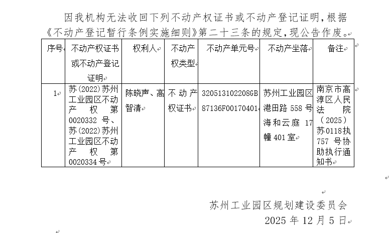 不動產權證書/登記證明作廢公告蘇園 證廢字2025(0186)號(海和云庭17幢401室)