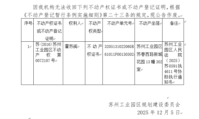 不動產權證書/登記證明作廢公告蘇園 證廢字2025(0184)號(新城花園13幢302室)