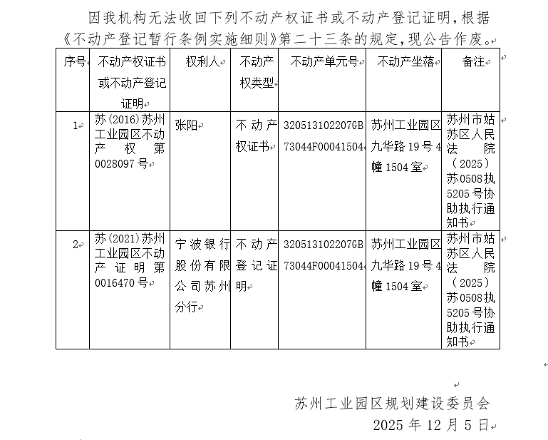 不動產權證書/登記證明作廢公告蘇園 證廢字2025(0189)號(蘇州工業園區九華路19號4幢1504室)