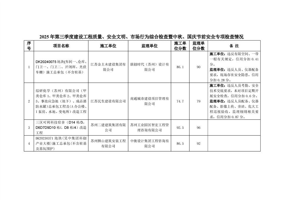 園區規劃建設委員會關于公布2025年第三季度建設工程質量、安全文明、市場行為綜合檢查暨中秋、國慶節前安全專項檢查情況的通知