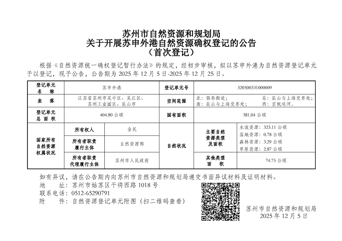 蘇州市自然資源和規(guī)劃局關(guān)于開展蘇申外港自然資源確權(quán)登記的公告(首次登記)