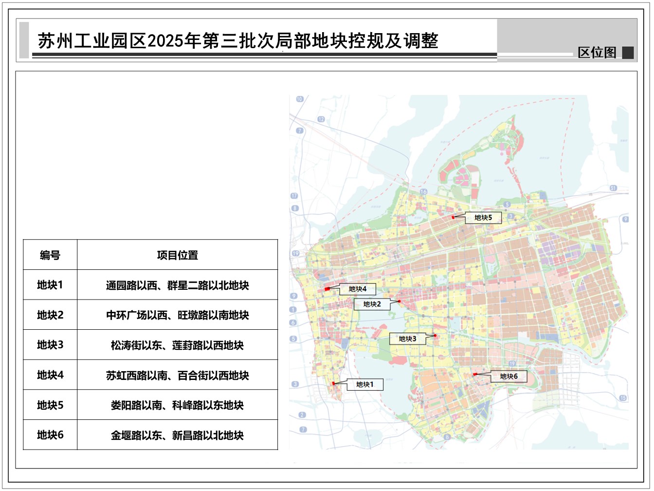 蘇州工業園區2025年第三批次局部地塊控規調整:共包括6個地塊,總用地面積約0.18平方公里,詳見附圖區位圖。