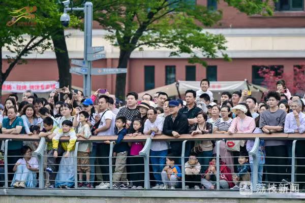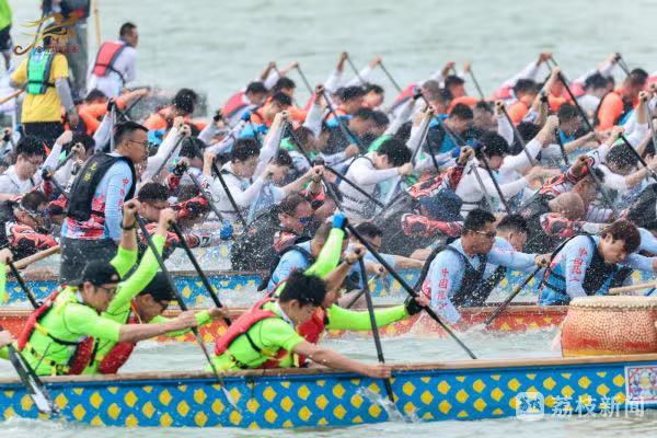金雞湖上,一艘艘龍舟上演百龍爭(zhēng)渡,龍舟隊(duì)員們齊心協(xié)力、揮槳如飛,向著終點(diǎn)全力沖刺。現(xiàn)場(chǎng),既有專業(yè)隊(duì)伍的速度與激情,也有國(guó)際友人解鎖“龍舟新姿勢(shì)”,彰顯著“龍舟精神”的多元魅力。如今,金雞湖端午龍舟賽已經(jīng)成為蘇州的新民俗,吸引了眾多的市民和游客前來(lái)觀賽,為自己喜愛(ài)的隊(duì)伍加油助威。