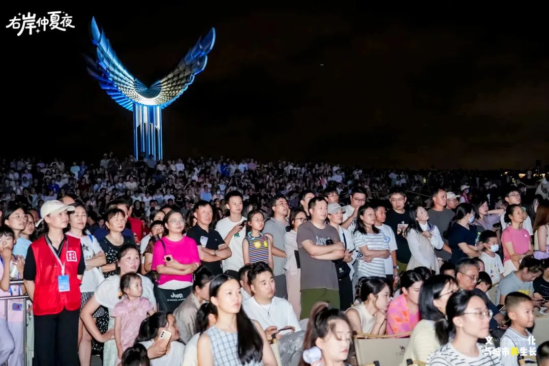 一場夏雨洗盡了白日的悶熱,湖畔涼風(fēng)習(xí)習(xí),正是享受音樂的絕佳時刻,右岸客廳下沉廣場的臺階上,早已坐滿了慕名而來的觀眾,飛翔雕塑旁、湖畔步道上處處是翹首以盼的身影。