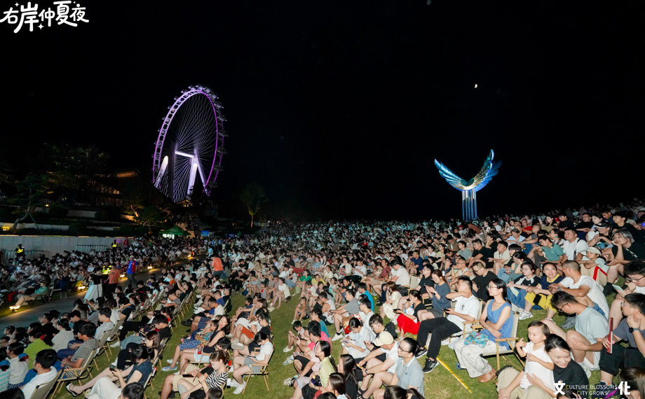 暮色漸染,金雞湖面倒映著天際最后一抹霞光。右岸客廳下沉廣場早已人頭攢動,市民游客翹首以待——又一個“右岸仲夏夜”即將啟幕。晚上七點半,音樂驟然響起,人氣樂隊以一首《離開地球表面》點燃夜空,瞬間引爆全場熱情。
