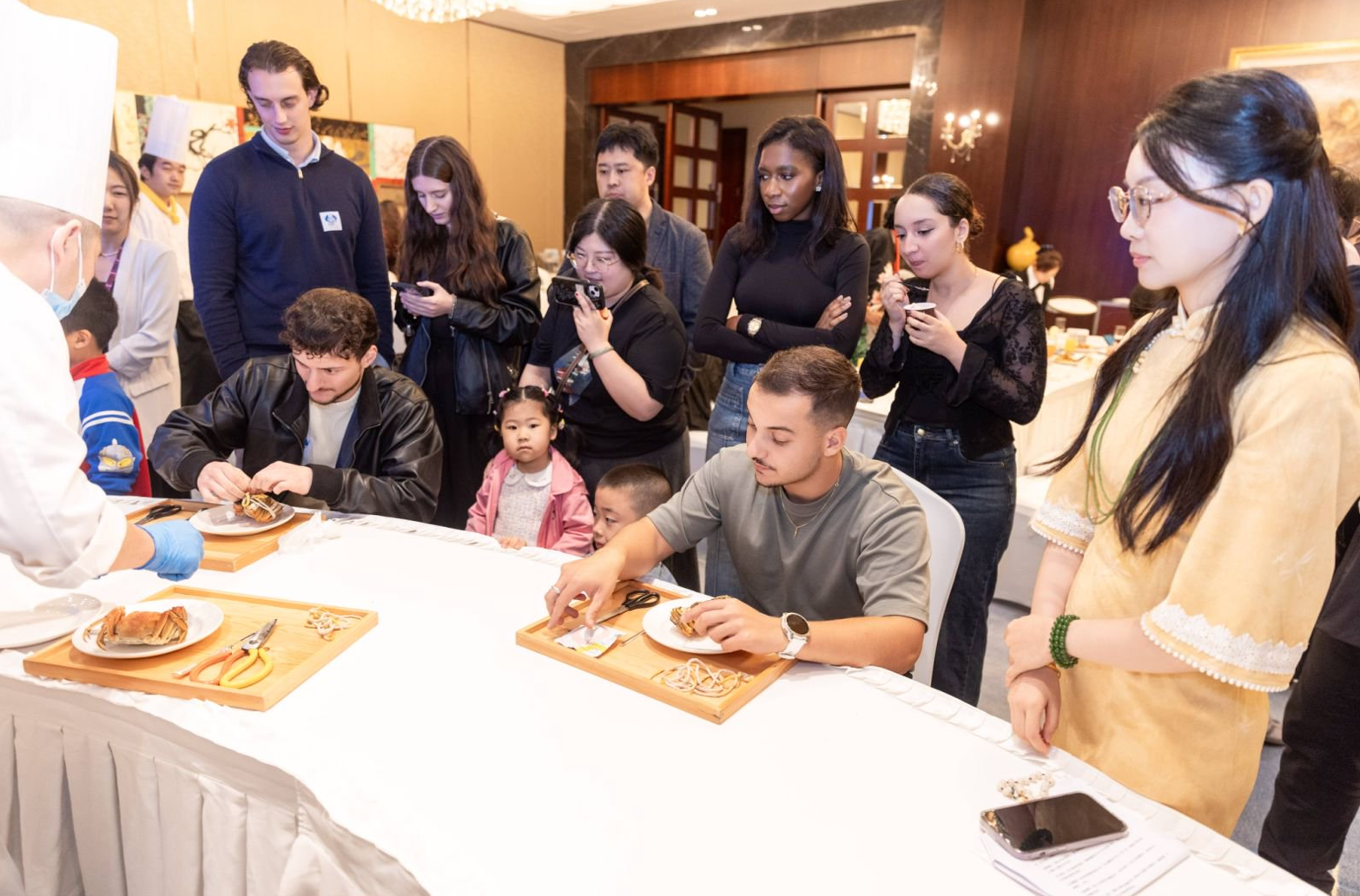 在品嘗美味的同時(shí),豐富多彩的文化互動(dòng)體驗(yàn)也吸引著眾多參與者。蘇式綠豆糕制作區(qū)里,在大廚的悉心指導(dǎo)下,不少外國(guó)朋友親手制作出精致的江南點(diǎn)心;陽(yáng)澄湖大閘蟹標(biāo)準(zhǔn)拆解演示,則讓食客們領(lǐng)略到江南飲食文化的深厚底蘊(yùn)。“筷子挑戰(zhàn)賽”和“盲品食物猜猜猜”等互動(dòng)游戲不僅拉近了彼此的距離,也讓中外文化交流更加輕松愉悅,現(xiàn)場(chǎng)不時(shí)傳來(lái)陣陣笑聲。