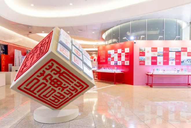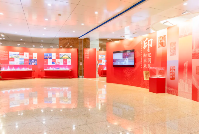 直播鏡頭跟隨導覽人的腳步,深入解讀了展覽的兩大構成部分。第一部分“印記園區(qū)”以94枚全新創(chuàng)作的印章,構建出“領航壁畫”“志合山海”“吳風湖韻”“勇立潮頭”“盛世江南”五大篇章。這些作品不僅凝結了園區(qū)篆刻愛好者與專業(yè)工作者的創(chuàng)意巧思,更特別聚焦于園區(qū)的經(jīng)濟發(fā)展、科技創(chuàng)新、自然景觀與產(chǎn)城融合圖景進行創(chuàng)作,讓古老的篆刻藝術與園區(qū)的現(xiàn)代化發(fā)展深度交融。