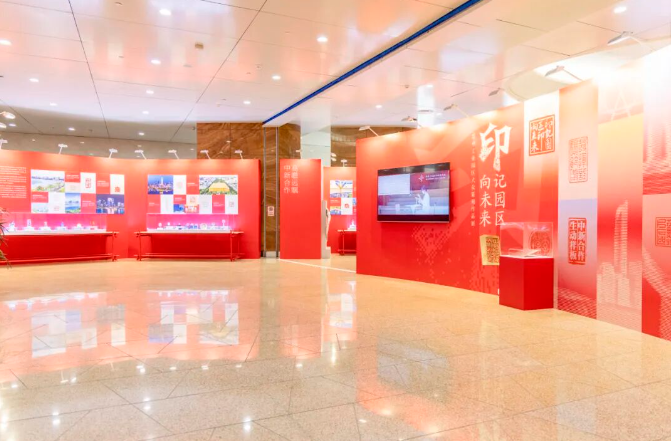 直播鏡頭跟隨導覽人的腳步,深入解讀了展覽的兩大構成部分。第一部分“印記園區”以94枚全新創作的印章,構建出“領航壁畫”“志合山海”“吳風湖韻”“勇立潮頭”“盛世江南”五大篇章。這些作品不僅凝結了園區篆刻愛好者與專業工作者的創意巧思,更特別聚焦于園區的經濟發展、科技創新、自然景觀與產城融合圖景進行創作,讓古老的篆刻藝術與園區的現代化發展深度交融。