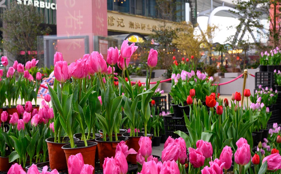 活動現(xiàn)場,嫩白的“凌波仙子”、鵝黃的重瓣水仙、甜美的山茶、典雅的蝴蝶蘭,以及獨具姿態(tài)的各色郁金香等,匯聚天幕東街和西街的中心廣場,構成一組組花團錦簇的特色景觀,引得市民游客紛紛駐足。