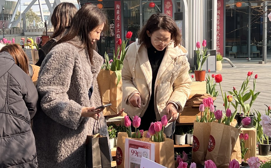 市民李小姐從餐廳出來就直奔花展,她說:“剛剛經(jīng)過時就注意到‘上新’了年宵花展,紫的神秘,紅的熱烈,黃的燦爛,不僅為街區(qū)增添了活力,也讓春節(jié)的氛圍更濃郁了!現(xiàn)場還能用積分兌換限定郁金香,既幸運又特別喜慶!”