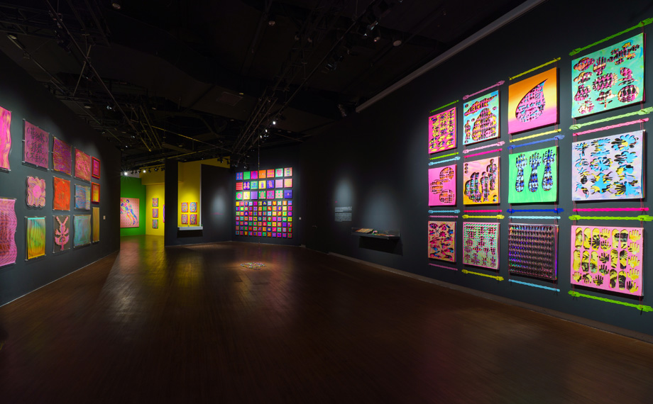 本次展覽以剪紙創作流程為主線,通過“起稿、上色、對折、剪刻、展開、拼組”六個步驟,系統呈現從構思到成品的完整藝術生產脈絡:起稿,靈感源自生活觀察,形成原創視覺文本;上色,運用高對比色彩體系,塑造強烈視覺個性;對折,借助對稱形式,隱喻人際與自我關系,剪刻,通過剪與留的取舍,體現減法創作哲學;展開,結合技術手段,釋放符號的當代意義;拼組,重組碎片完成敘事閉環,實現跨媒介轉換。