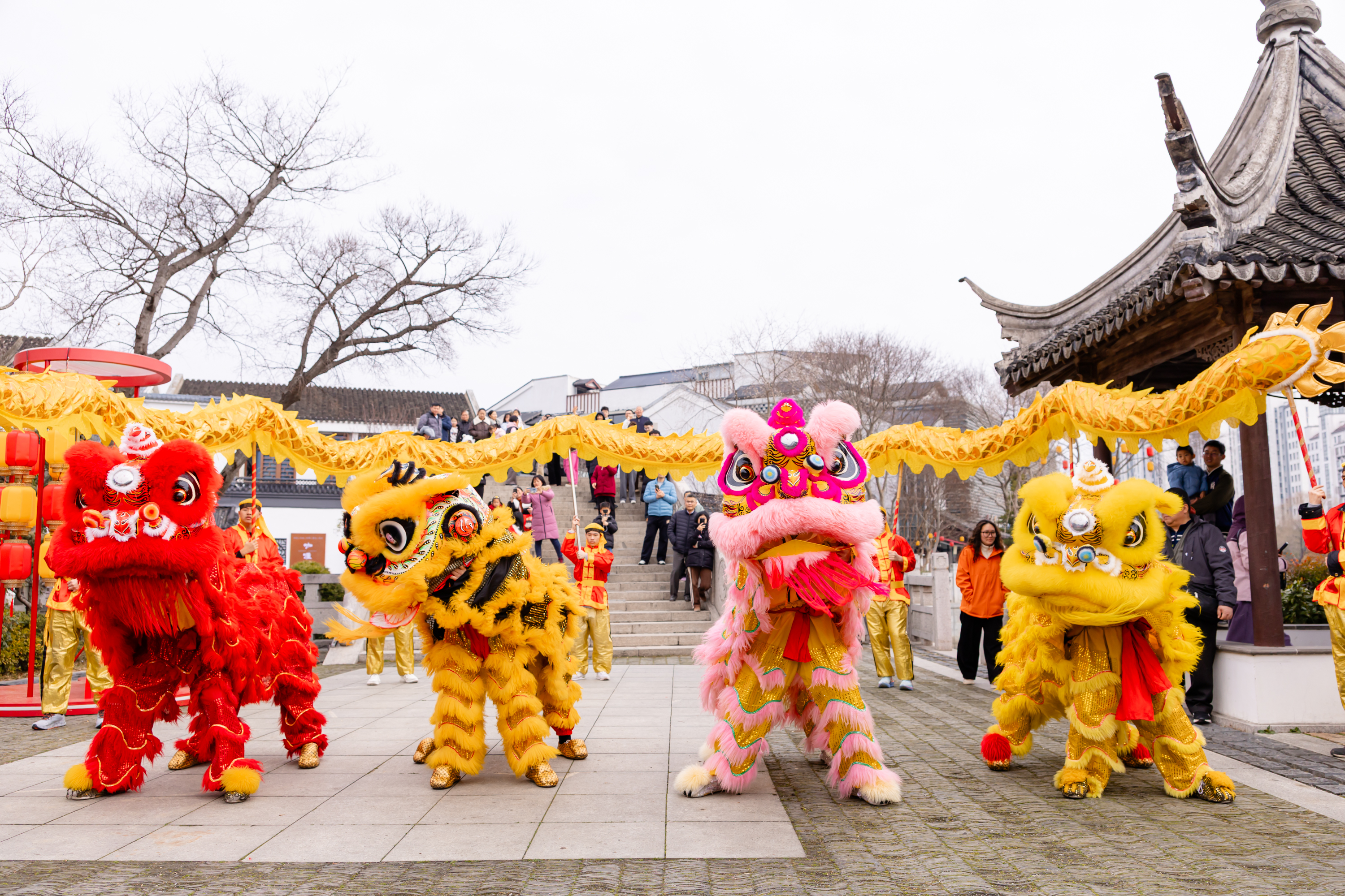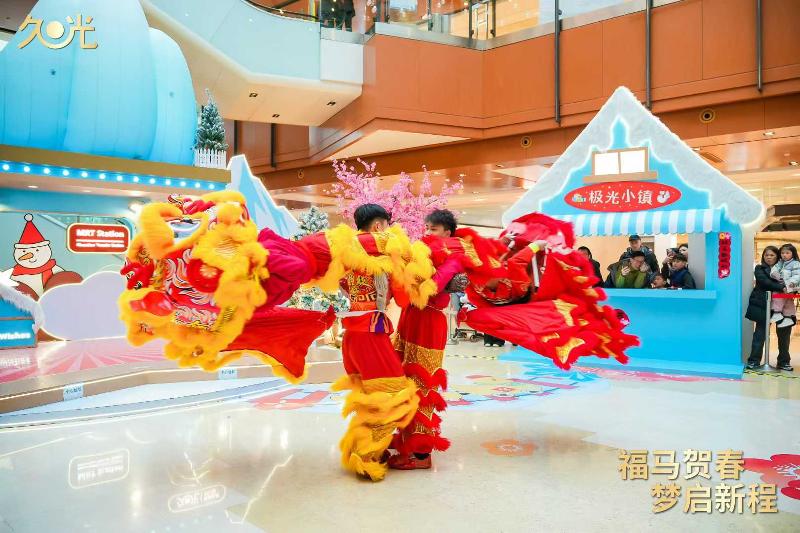 非遺演出更是精彩紛呈。木鳥象劇團帶來的非遺燈彩主題巡游將剪紙、年畫、風箏等元素幻化于華服與燈彩,交織成流動的光影劇場;大年初一,夏國璋龍獅團以梅花樁、一柱擎天等高樁表演獻上了精彩的開年好戲。