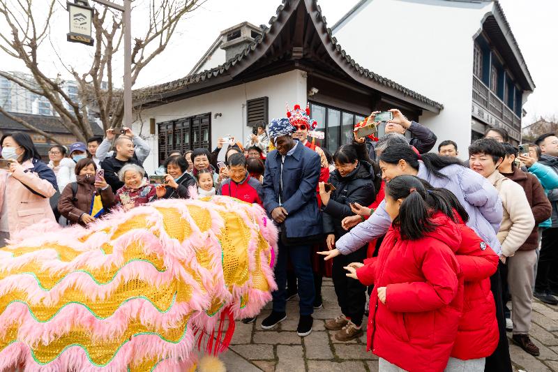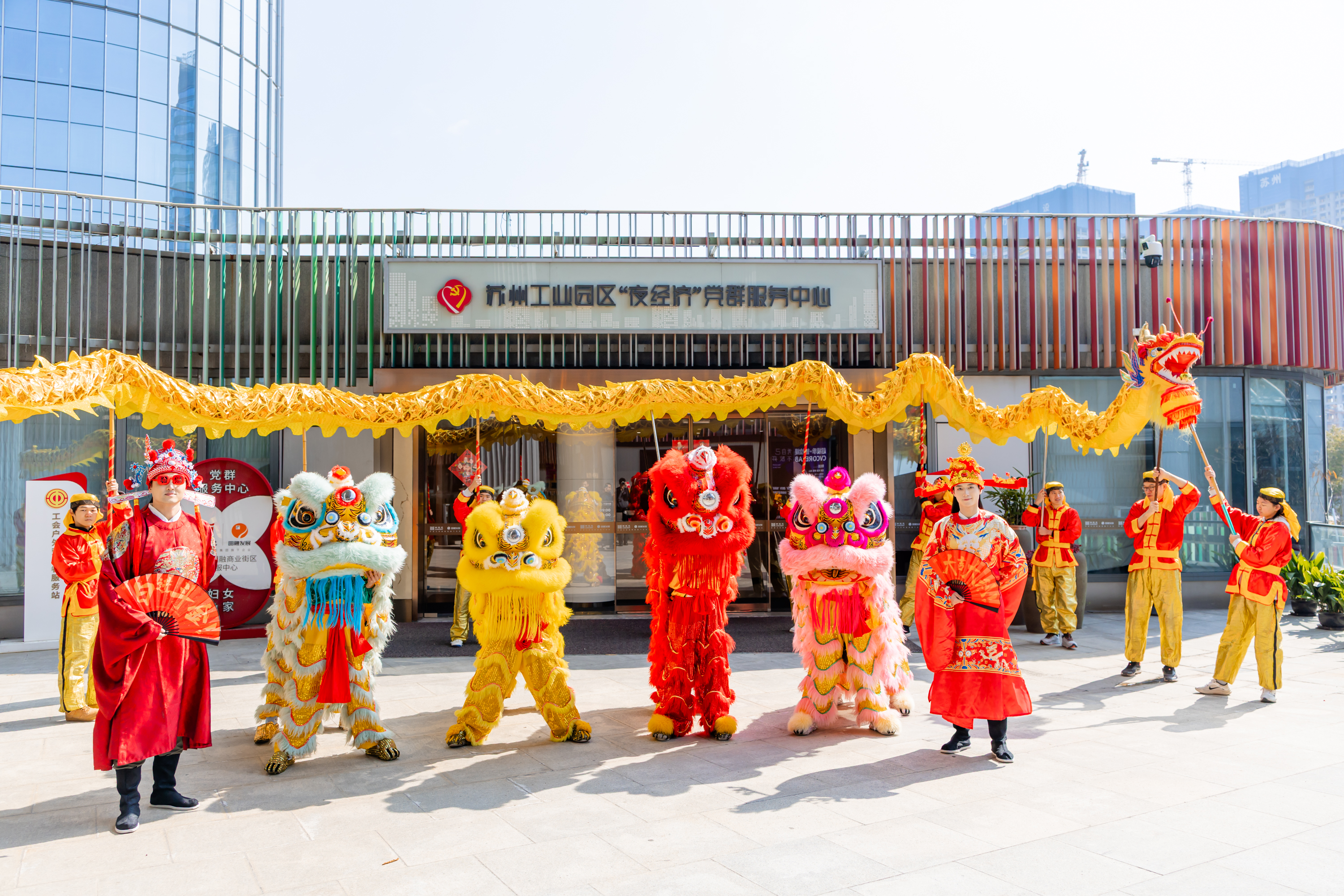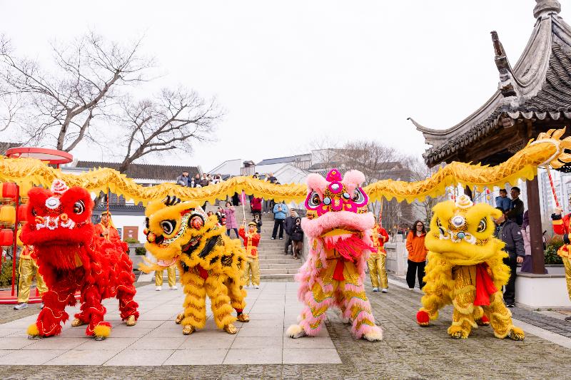 大年初一、初五,園區圓融時代廣場、斜塘老街、月光碼頭、李公堤四大商圈人聲鼎沸、鑼鼓喧天,由蘇州市舞龍燈非物質文化遺產代表性傳承人蔣達夫帶領的百花洲龍燈隊,為市民游客獻上了一場場氣勢恢宏的舞龍舞獅表演,用傳統民俗點燃新春喜悅。