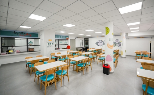 步入食堂,明亮整潔的環境令人眼前一亮。約250平方米的空間經合理規劃,分為廚房、餐廳與預留區域。廚房配備標準化廚具與規范的消防、監控設施;餐廳以簡約溫馨的風格布置,充足的餐桌椅與暖心的宣傳標語,共同營造出舒適的用餐氛圍。