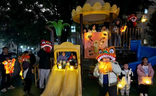 夜幕降臨,華燈初上,活動迎來了高潮——“燈火萬家·流動的‘XIN’福”花燈巡游。由社區工作人員、志愿者以及手持自制花燈的親子家庭組成的巡游隊伍,宛如一條流動的燈河。巡游隊伍從生機盎然的社區蔬樂園出發,寓意著耕耘與收獲;隨后蜿蜒穿行至熱鬧的居民樓下,將祝福送到家家戶戶門前;最終抵達孩子們的樂園社區游樂場,這里是夢想起航的地方。一路上,由志愿者和社區青少年組成的“舞獅隊”與居民熱情互動,小獅子調皮地眨著眼睛,向大家拱手拜年。小朋友們熱情地向沿路的居民贈送精致的元宵燈籠,一只只燈籠傳遞到居民手中,點亮了夜色,也溫暖了人心。
