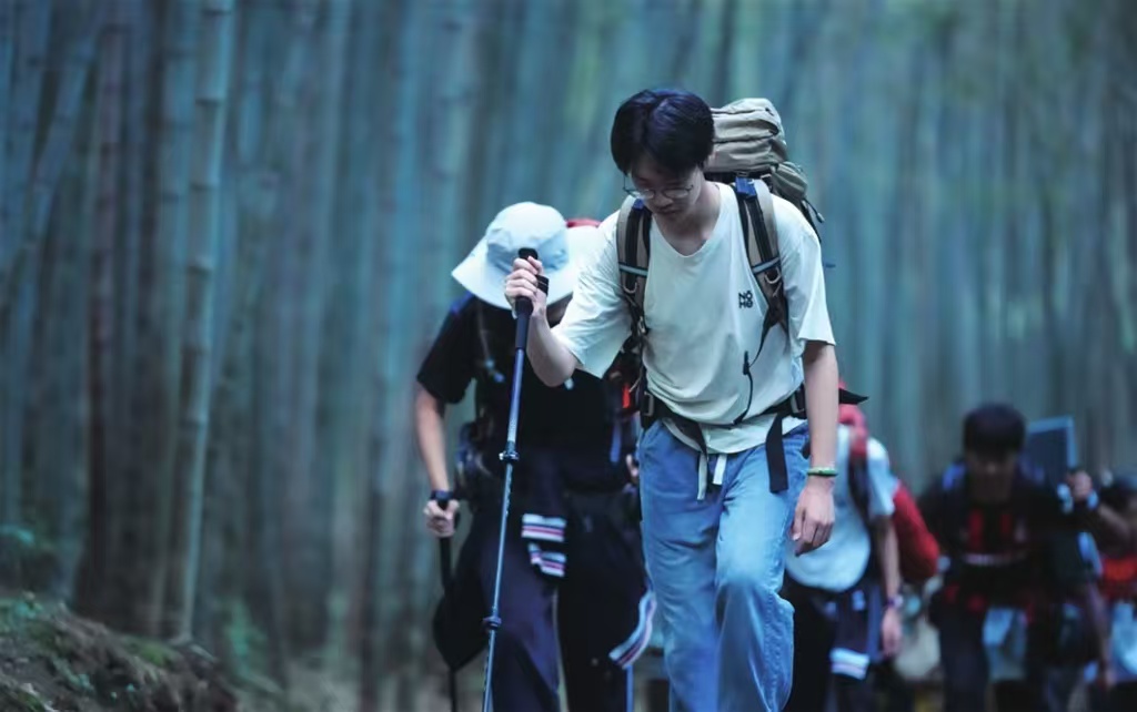 此次探險中,騎行隊伍以“百來公里”為目標,在平路與風雨中交替前行,汗水反復浸濕衣衫,每一公里都是對意志力的淬煉;徒步人員則背負行囊深入崎嶇山路,近40公里的路程里,沉重背包與濕滑陡坡考驗著平衡與體能,高溫與風雨更讓這段旅程充滿挑戰。從晨曦到日暮,學子們全程自主規劃路線、協作扎營做飯,在團隊互動中完成體力與意志的雙重考驗。