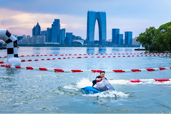 The southern shore of Jinji Lake was even more vibrant. Water motorcycles carved dazzling white waves, while stand-up paddleboard yoga enthusiasts moved in unison through a series of “Tree Pose” movements under the glow of the setting sun.