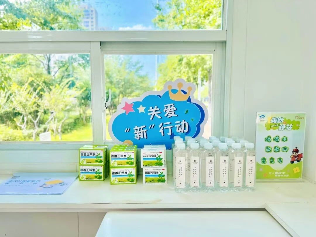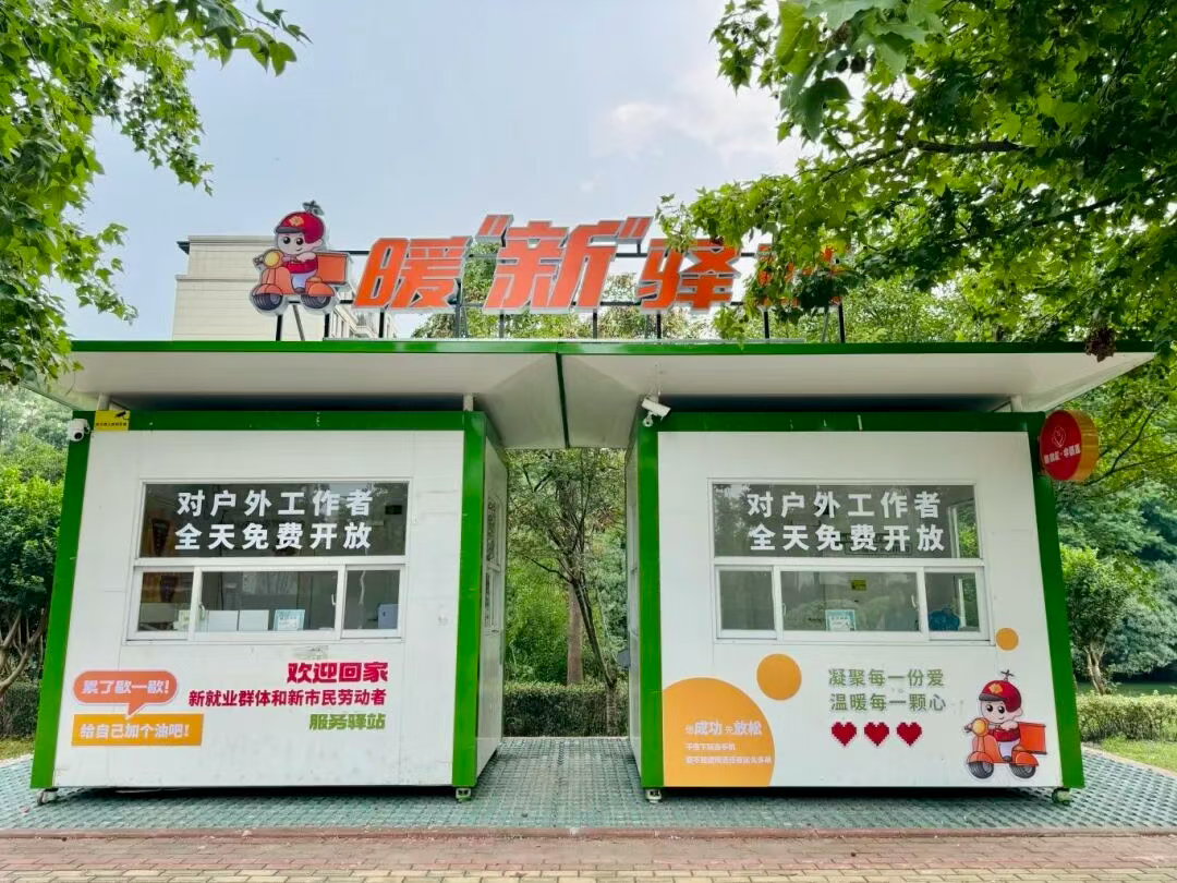 這個(gè)不大的空間,由兩座閑置亭子改造而成:空調(diào)送出徐徐涼風(fēng),充電插座的指示燈靜靜閃爍,墻上掛著共享雨傘,角落的便民箱里備有礦泉水、創(chuàng)可貼等物資。最讓騎手們滿意的是,驛站24小時(shí)開放,即便深夜下班,也能進(jìn)來喝上一口熱水。